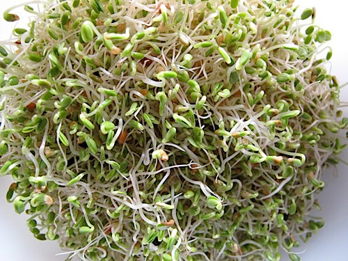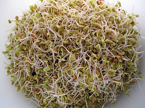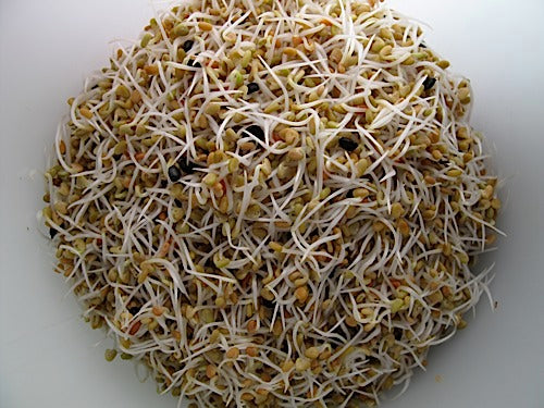 The inclusion of Garlic and Cress - two amazingly tasty sprouts has made Italian Blend our 2nd most popular Leafy sprout blend of all time! Only French Garden is more popular. Italian Blend is a great way to enjoy Garlic Sprouts (which cost so darn much solo) along with other tasty nutritious sprouts. We include a lot of Garlic in this mix because it is slower to sprout than the rest of the seeds. The volume of Garlic seed provides the flavor we are after, but when we sprouted this for our farmers market, we sprouted the Garlic for several days and then mixed the sprouts in with the other seeds after they had sprouted for a day. That method uses less Garlic, and the texture is somewhat improved, but over the years we have found that mixes that require 2 steps often scare folks away - that's why we sell this as a one-step mix, but we may add a 2-step option in the future for those of you who don't mind the challenge and want to experience Italian Blend at its absolute finest. In the meantime, you can always pump it up by buying some Garlic straight and sprouting it for 5-7 days before soaking the mixed seeds.