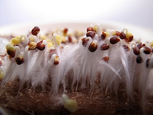 Note: These wonderful little Brassica plants have a unique root structure. Brassicas will show microscopic roots starting around day 3. They are called root hairs and are most visible just before watering - when the plants are at their driest. These root hairs impress many people as mold - but they are not. Now you know. Isn't learning fun?!