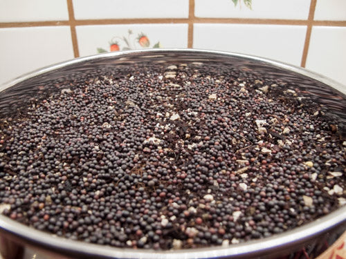 When growing Micro-Greens we start with a thoroughly moistened Medium, upon which we spread our dry seed, and then cover with a plate. The seed of most Brassicas is virtually identical. What you are seeing here is both Green Kale seed (on the left) and Red Russian Kale seed (on the right). Can You see the difference?;-)