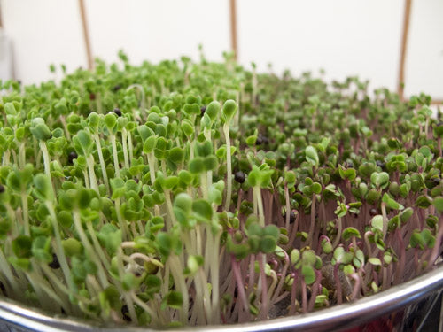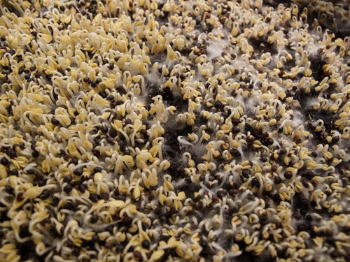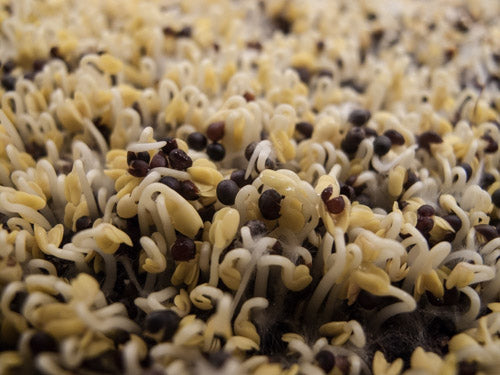 Note: These wonderful little Brassica plants have a unique root structure. Brassicas will show microscopic roots starting around day 3. They are called root hairs and are most visible just before watering - when the plants are at their driest. These root hairs impress many people as mold - but they are not. Now you know. Isn't learning fun?!