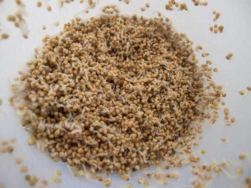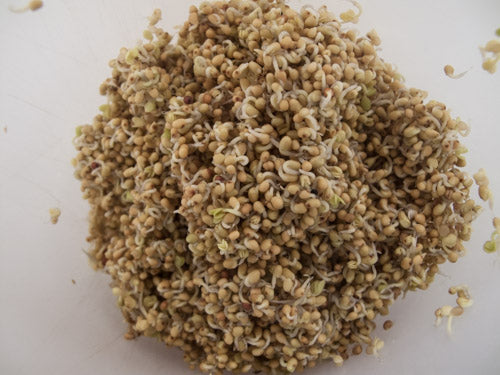 A wonderful tender sprout, this Mustard tastes like Horseradish - Mmmmm! This is Oriental Mustard - it is a yellow seed and is the only non-muciloginous Mustard we've ever seen and therefore the only (non-Asian) Mustard you can sprout in a conventional sprouter. This is one of the more difficult sprouts to grow, but the flavor is so fantastic that we consider it worth the extra work. Oriental Mustard is hard to find as very few farmers grow it. We have gone years without it more than once, so get it while you can. Our current crop is something of a miracle in fact. Early snow in Saskatchewan this past fall buried a beautiful crop of Oriental Mustard. The miracle is that there was a freak warm spell in November (amazing!) that lasted long enough (amazing!) for the seed to get harvested. Beyond that, the moisture did not damage the seed. That is truly amazing.