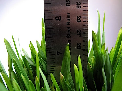 There are some who maintain that Grass doesn't reach its full nutritional value until its blades "split" - or a second blade grows. It is pretty difficult to grow Grass this big in a small container. It usually wilts before it can do this, but it is possible. Just keep your crop moist and examine the blades of Grass - from day 8 on - to see if they are "splitting". It happens low on the blade - within the first inch or so above the medium. Harvest as soon as you see the split.