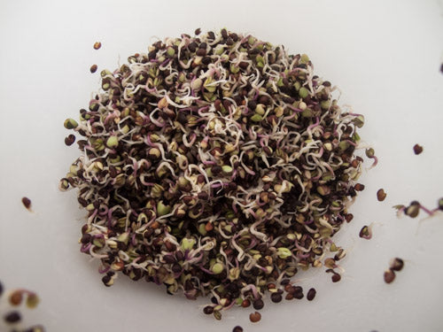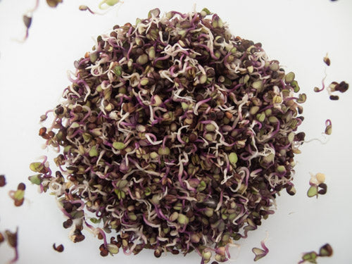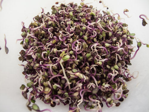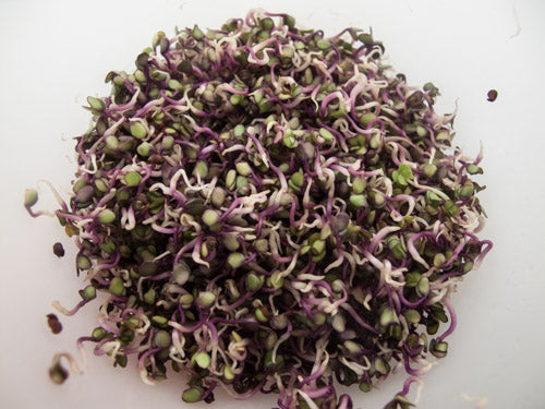 These seeds sprout a little slowly and unevenly, but they have a certain delicate bitter sweetness that I've come to sometimes crave sprout-wise.They're a bit tinier than broccoli sprouts, which you can't tell from the main photo, and the purple isn't quite so pronounced, it's mainly just along the leaf edges, but in any case, they're tasty and I'm glad took a chance and tried them.
