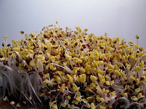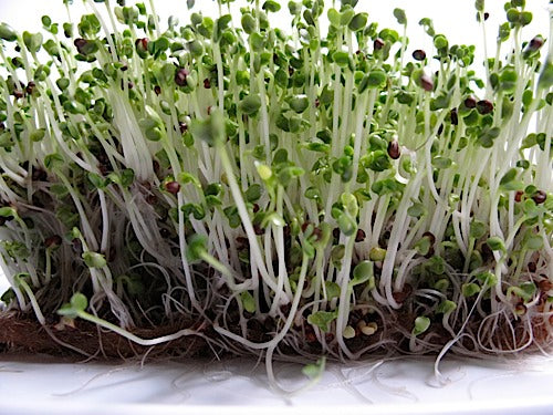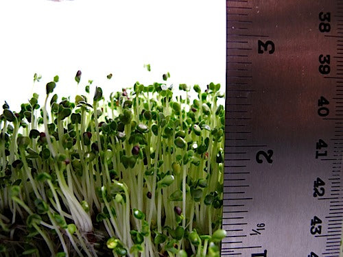 Note: These wonderful little Brassica plants have a unique root structure. Brassicas will show microscopic roots starting around day 3. They are called root hairs and are most visible just before watering - when the plants are at their driest. These root hairs impress many people as mold - but they are not. Now you know. Isn't learning fun?!